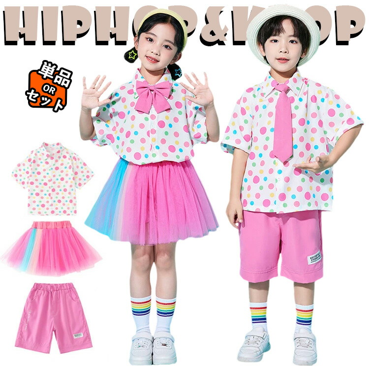 ピンク チュールスカート パンツ 白 カジュアルシャツ チア チアガール キッズ ダンス衣装 セットアップ 上下セット おしゃれ 女の子 男の子 かっこいい かわいい 半袖 水玉柄 ダンス