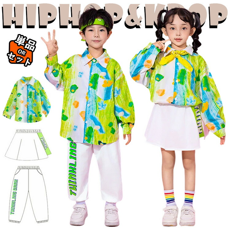 チア チアガール 緑 柄シャツ 白 ウェストパンツ スカート キッズ ダンス衣装 セットアップ 上下セット おしゃれ 女の子 男の子 子供 かっこいい かわいい 半袖 トップス ダンスウエ