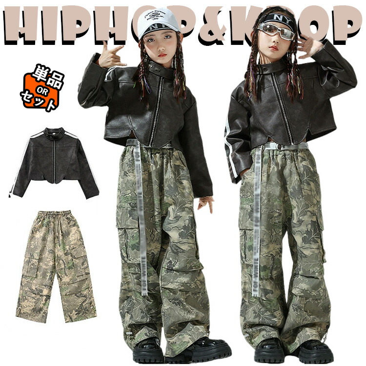 黒 レザージャケット 迷彩 カーゴパンツ タンクトップ キッズ ダンス衣装 セットアップ 上下セット 韓国 jazz おしゃれ 女の子 子供 かっこいい かわいい 長袖 トップス ダンスウエア