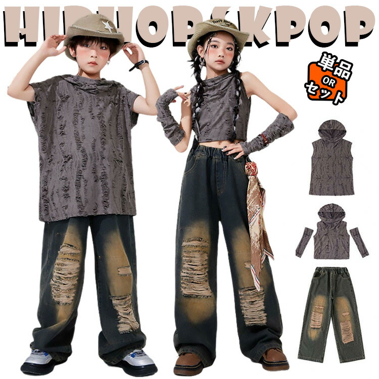 グレー トップス ネイビー デニムパンツ 腕カバー ダメージ加工 キッズ ダンス衣装 セットアップ 上下セット おしゃれ 女の子 男の子 子供 かっこいい かわいい 半袖 ダンスウエア ヒ