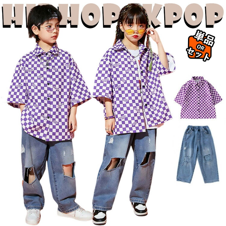 パープル チェック柄 カジュアルシャツ ブルー デニムパンツ キッズ ダンス衣装 セットアップ 上下セット おしゃれ 女の子 男の子 子供 かっこいい かわいい 半袖 トップス ダンスウ