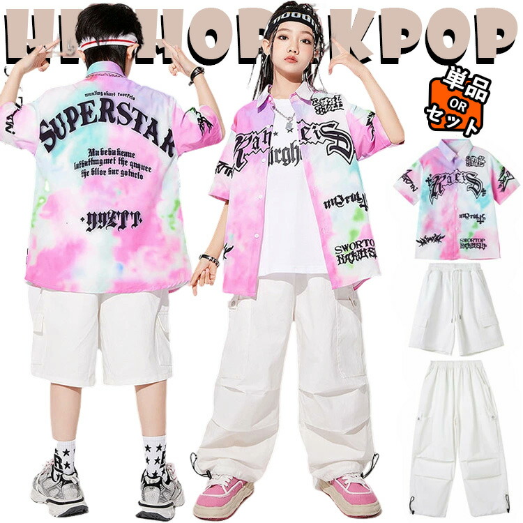 キッズ ダンス衣装 セットアップ 総柄 柄シャツ 半袖 シャツ カジュアルシャツ 女の子 男の子 インナー トップス ハーフパンツ ロングパンツ カーゴパンツ サルエルパンツ 韓国 -