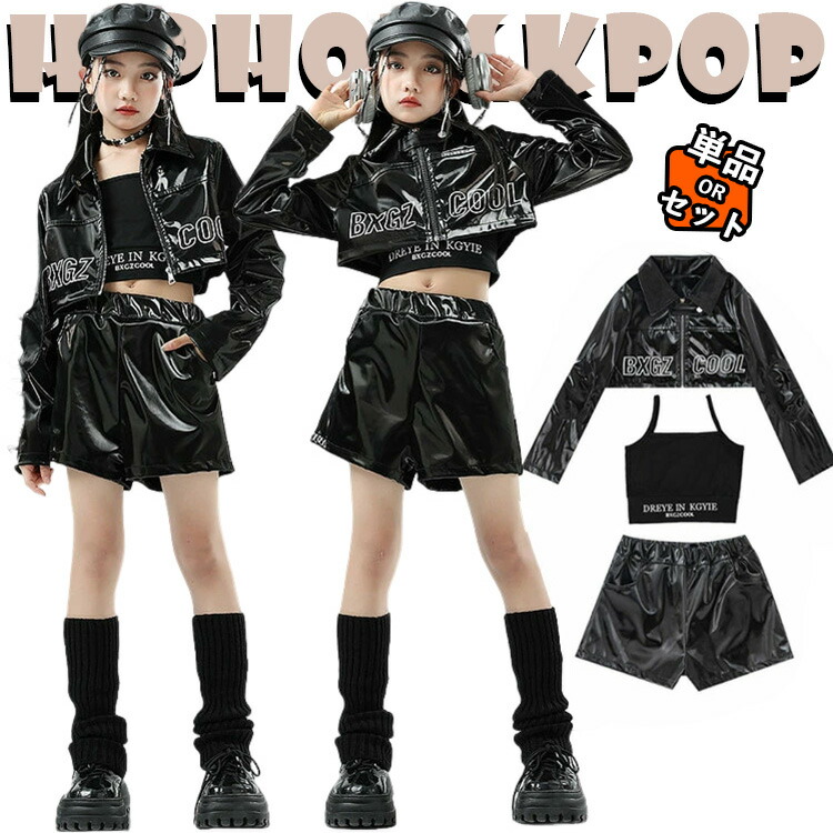 キッズ ダンス衣装 セットアップ PU 黒色 ショート丈 長袖 ジャケット チア チアガール 女の子 キャミソール へそ出し ファッション ショート丈パンツ 韓国 k-pop おしゃれ ジャズダ