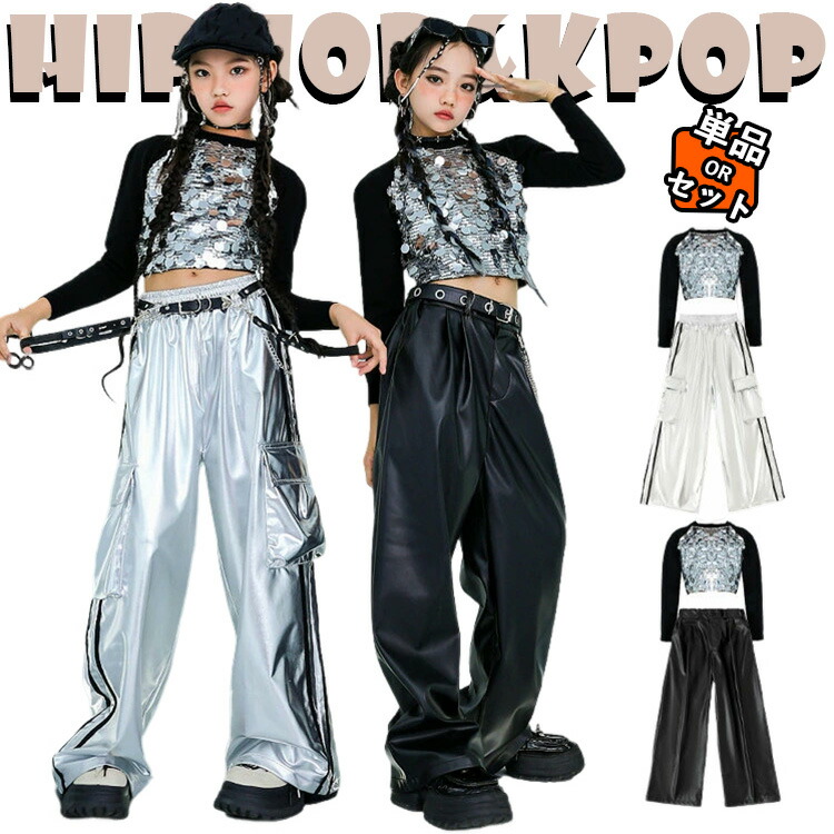 シルバー 光沢 へそ出し キラキラ キッズ ダンス衣装 セットアップ ファッション 長袖 女の子 ショート丈 カーゴパンツ サルエルパンツ カジュアル ギャル系 ジャズダンス ヒップホ