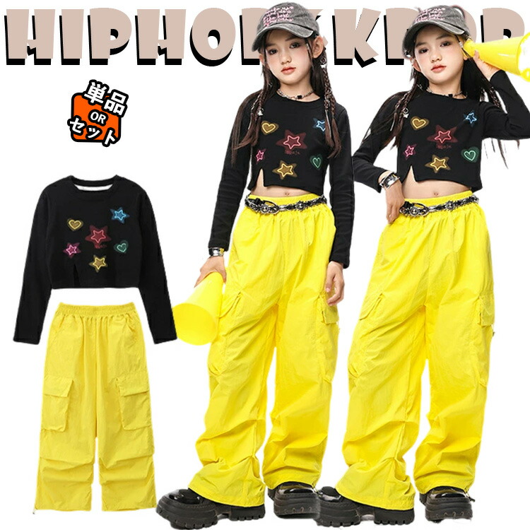 チアガール へそ出し 黄色 黒 キッズ ダンス衣装 セットアップ 女の子 Tシャツ ショート丈 ブラック カーゴパンツ イエロー ファッション かっこいい かわいい おしゃれ 演出服 発表
