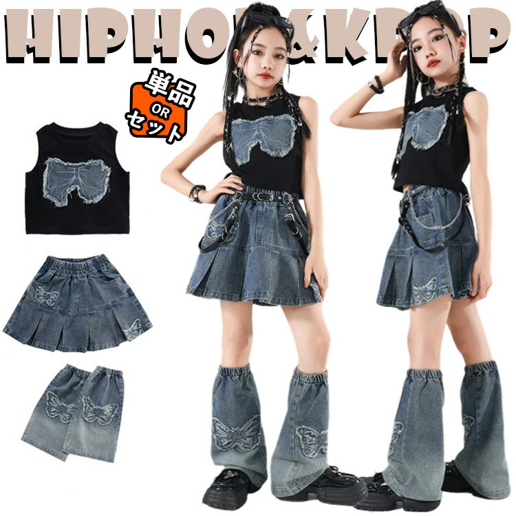 デニムスカート ブルー 黒 ショートトップ へそ出し 蝶結び 女の子 jazz チア チアガール チアリーダー 可愛い かっこいい ジーンズダンス 韓国 K-POP キッズ ダンス衣装 子供 夏 人