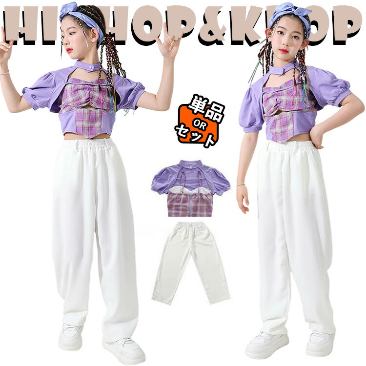 jazz チア チアガール 女の子 ワイドパンツ ショートトップ へそ出し チェック柄 セットアップ ホワイト パープル チアリーダー 可愛い かっこいい ジーンズダンス 韓国 K-POP キッズ