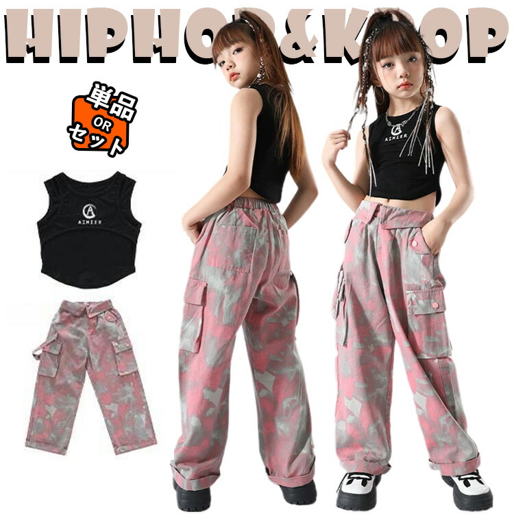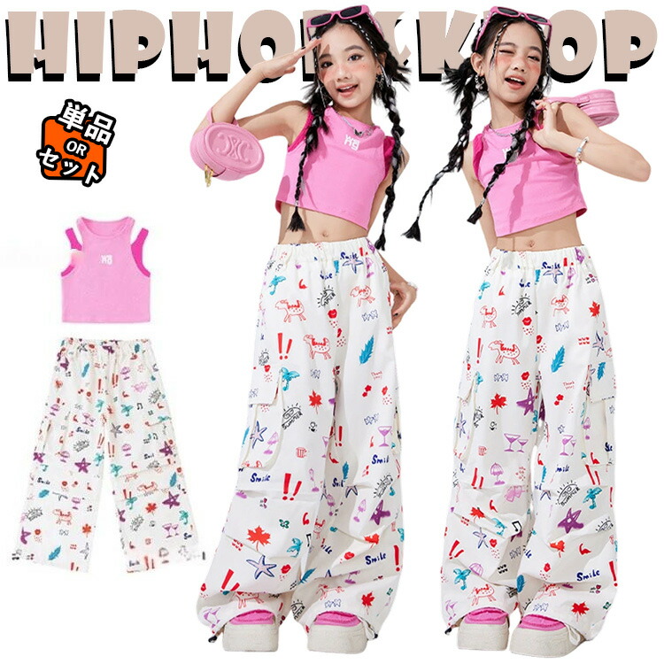 jazz へそ出し タンクトップ 桃色 韓国k-pop 女の子 チア チアガール カーゴパンツ ショートトップ ピンク ワイドパンツ セットアップ 袖無し 総柄 ズボン チアリーダー キッズ ダン