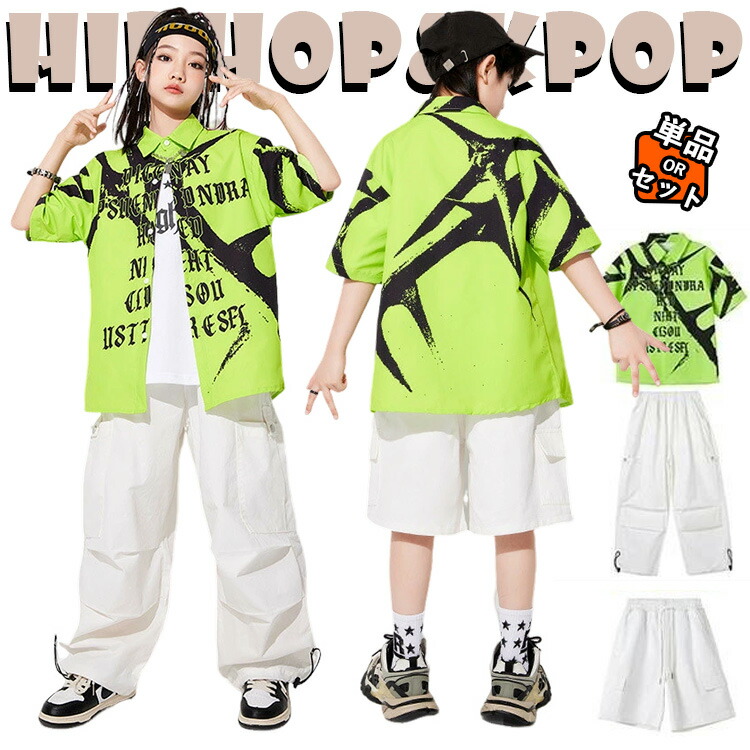グリーン 白 緑 カーゴパンツ シャツ シャツ セットアップ 女の子 男の子 キッズ ダンス衣装 ゆったり ワイドパンツ 半ズボン 半袖 柄シャツ ダンス かっこいい おしゃれ ヒップホッ