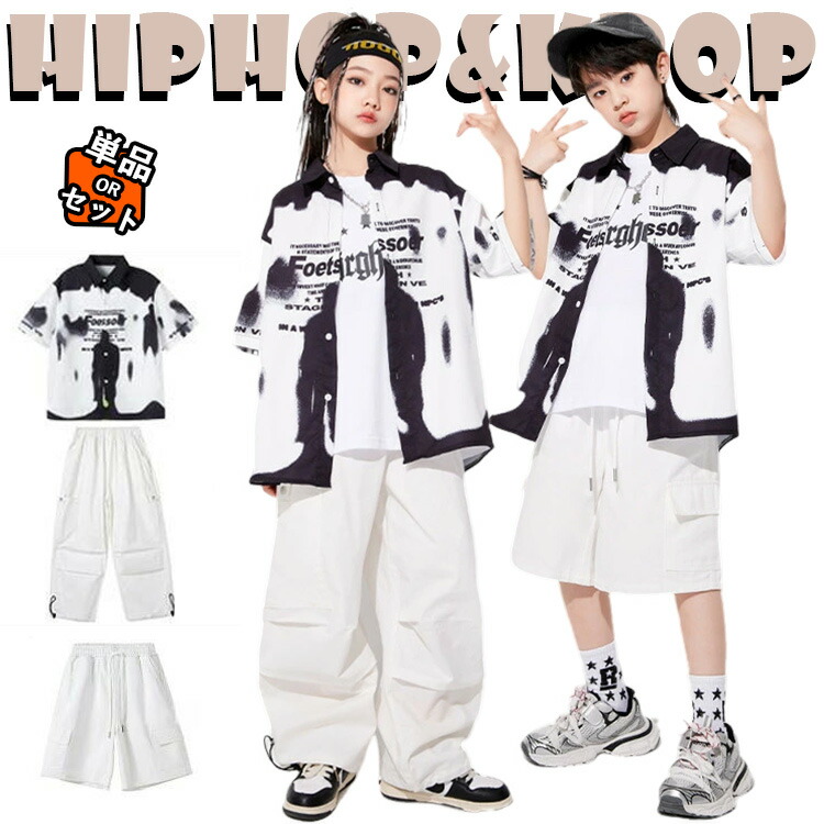 カーゴパンツ シャツ シャツ セットアップ 女の子 男の子 キッズ ダンス衣装 ホワイト 白 黒 ゆったり ワイドパンツ 半ズボン 半袖 柄シャツ ダンス かっこいい おしゃれ ヒップホ
