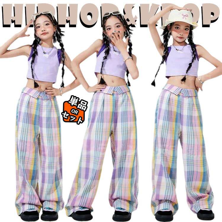 jazz 韓国 パープル タンクトップ チェック柄 カーゴパンツ キッズ ダンス衣装 セットアップ おしゃれ 女の子 かっこいい かわいい ゆったり 半袖 へそ出し トップス ヒップホップ ジ