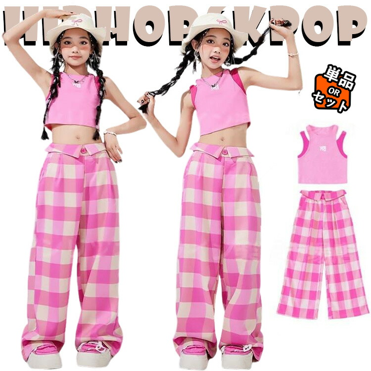 韓国 jazz ピンク タンクトップ チェック柄 ウェストパンツ キッズ ダンス衣装 セットアップ おしゃれ 女の子 かっこいい かわいい ゆったり 半袖 へそ出し トップス ヒップホップ ジ