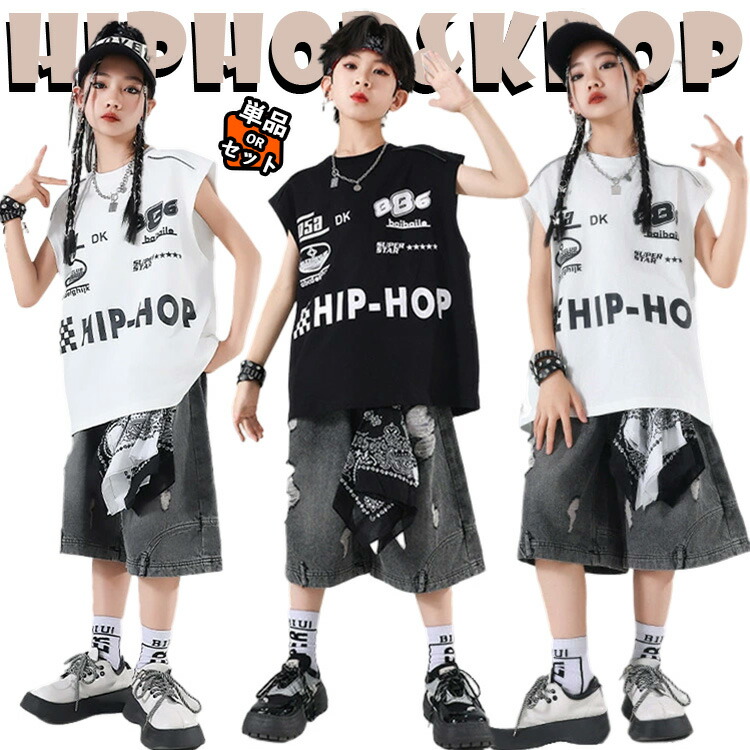 HIPHOP デニム短パン トップス 半ズボン ダメージ加工 ゆったり 総柄 黒 白 灰色 袖無し 女の子 男の子 韓国 K-POP セットアップ 上下セット かっこいい ジーンズダンス 夏 キッズ