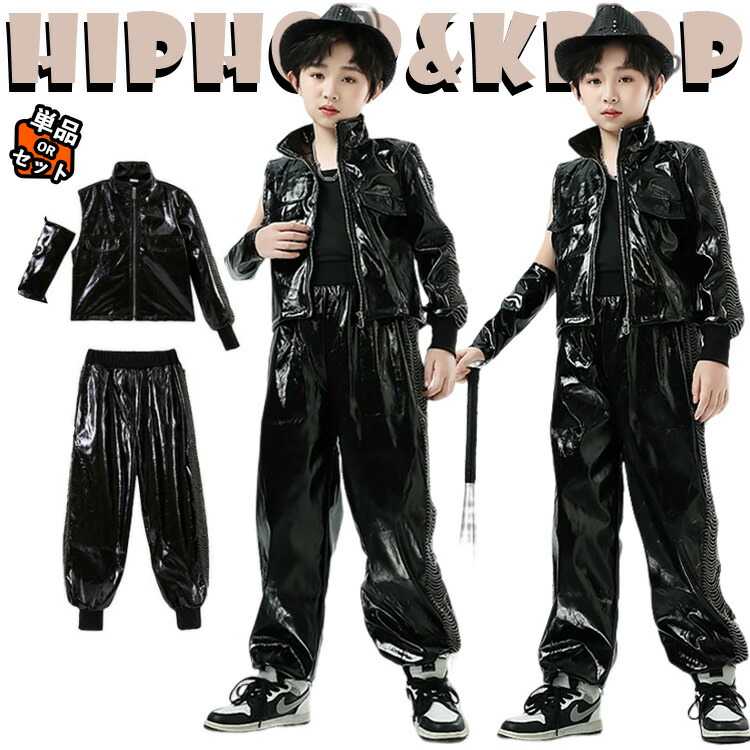 ブラック 黒 韓国K-POP HIPHOP セットアップ PU レザー ワイドパンツ ジャケット トップス キラキラ 長袖 ゆったり 男の子 女の子 キッズ ダンス衣装 ワイドパンツ 上下セット ズボ