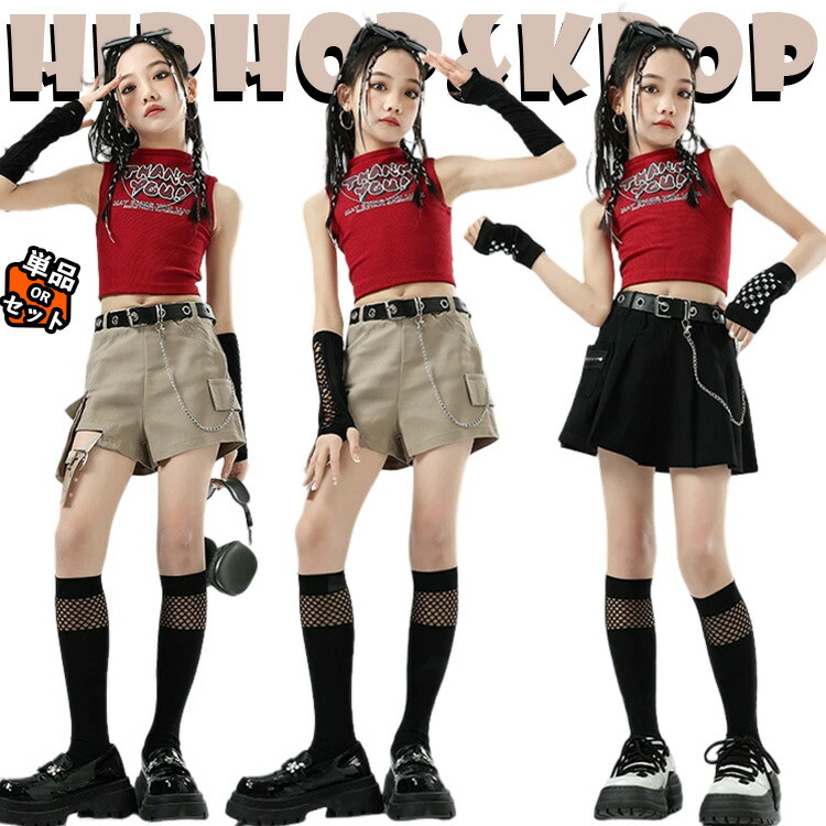 jazz へそ出し タンクトップ ワインレッド ブラック 韓国k-pop 女の子 チア チアガール スカート ショートトップ 半ズボン セットアップ ベルト 袖無し チアリーダー キッズ ダンス衣