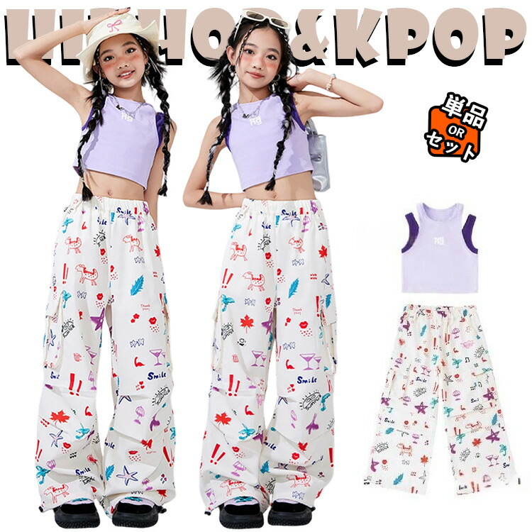 パープル 紫 jazz ワイドパンツ へそ出し タンクトップ 総柄 韓国k-pop 女の子 チア チアガール カーゴパンツ ショートトップ セットアップ 袖無し ズボン チアリーダー キッズ ダン