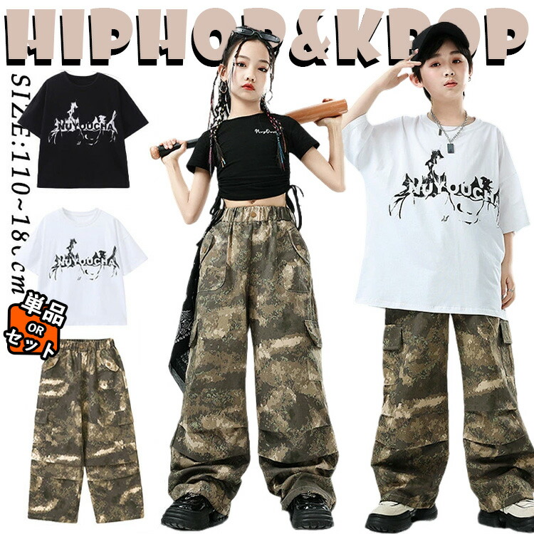 迷彩柄 カーキグリーン 黒 白 カーゴパンツ Tシャツ 半袖 ゆったり 女の子 男の子 キッズ ダンス衣装 韓国k-pop jazz ワイドパンツ セットアップ 上下セット 柄Tシャツ 迷彩 ズボン
