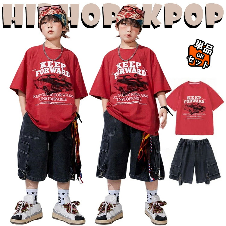 レッド シャツ グレー デニム カーゴパンツ キッズ ダンス衣装 セットアップ 上下セット おしゃれ 女の子 男の子 子供 かっこいい かわいい 半袖 トップス カジュアル ダンスウエア