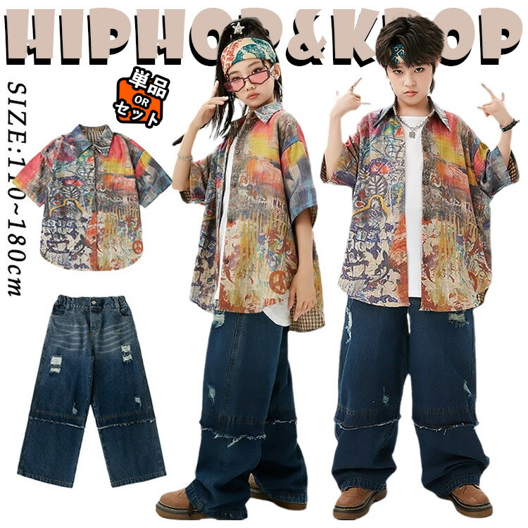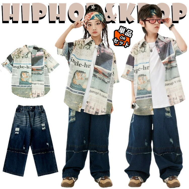 ゆったり カジュアル ヒップホップ 柄シャツ デニムパンツ キッズ ダンス衣装 女の子 男の子 HIP-HOP 韓国 k-pop セットアップ 総柄 ブルー ダメージ加工 ズボン 半袖シャツ おしゃれ