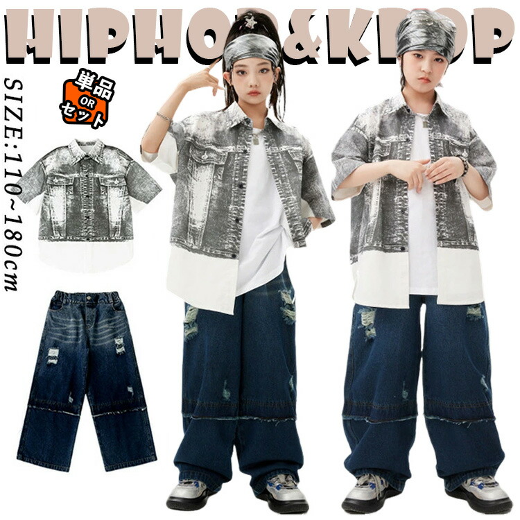ヒップホップ グレー 柄シャツ デニムパンツ キッズ ダンス衣装 セットアップ ゆったり カジュアル 総柄 灰色 ブルー ダメージ加工 ズボン 半袖シャツ 女の子 男の子 HIP-HOP 韓国 k-