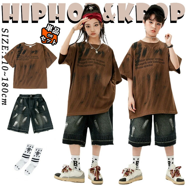 Tシャツ 半ズボン ブラウン ダークグレー 女の子 男の子 セットアップ ヒップホップ ゆったり カジュアル 柄tシャツ デニム短パン キッズ ダンス衣装 HIP-HOP 韓国 k-pop おしゃれ