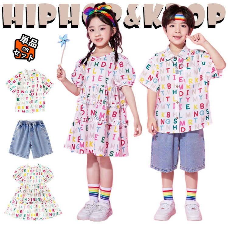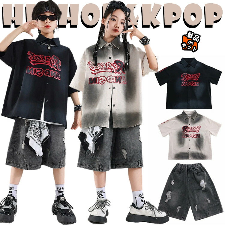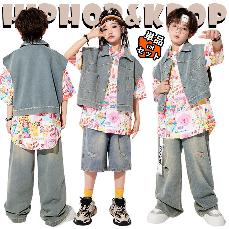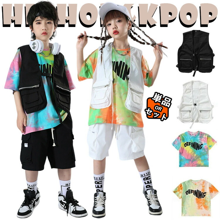 韓国 - ベスト シャツ 半ズボン ゆったり 虹色 総柄 黒 白 女の子 男の子 セットアップ ブラック ホワイト かっこいい ジーンズダンス 半袖シャツ 夏 キッズ ダンス衣装 おしゃ