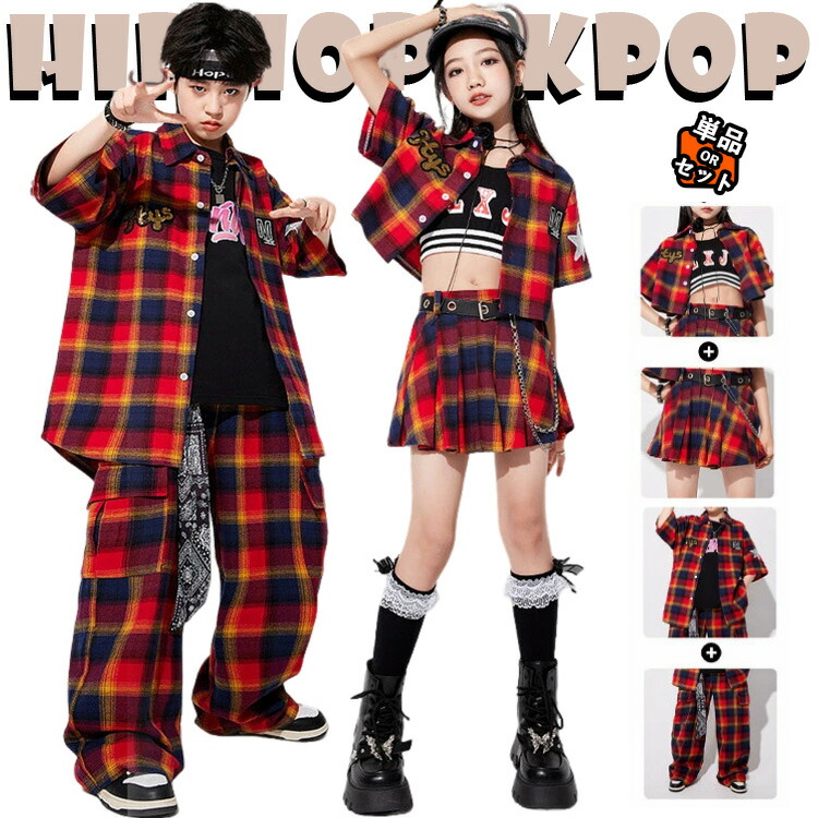 キッズダンス衣装 セットアップ 赤色 チェック柄 ショート丈 ジャケット 男の子 女の子 かっこいい 半袖 派手 カジュアルシャツ へそ出し トップス おしゃれ スカートセット パンツ