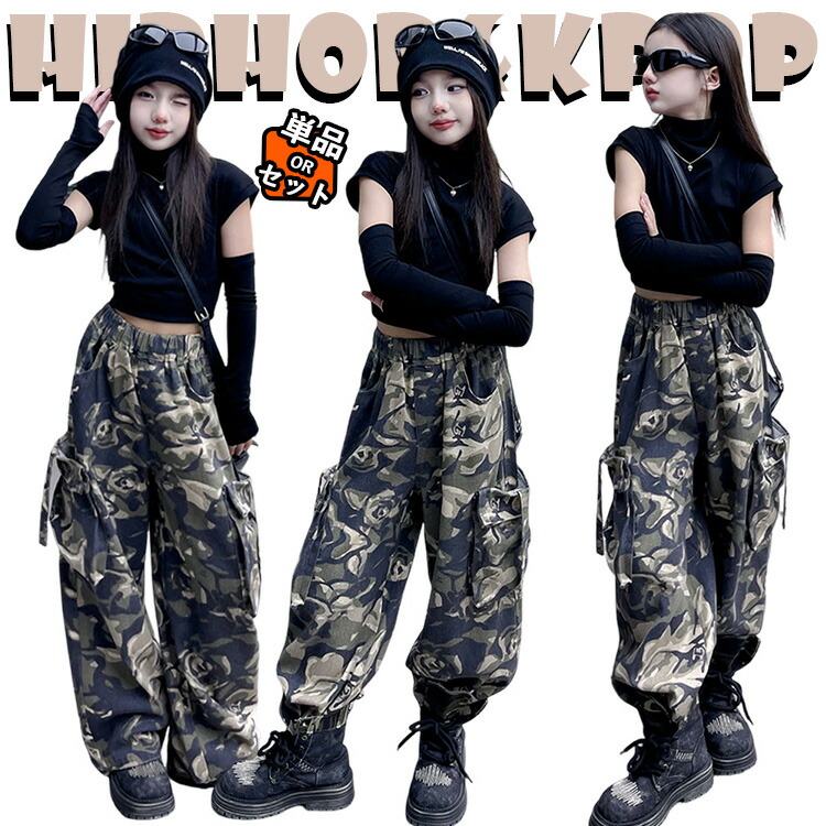 迷彩柄 カーキグリーン 黒 女の子 セットアップ カーゴパンツ トップス ブラック へそ出し 韓国 - 春秋 夏 ズボン かっこいい キッズ ダンス衣装 上下セット 子供 ジャズ ダ