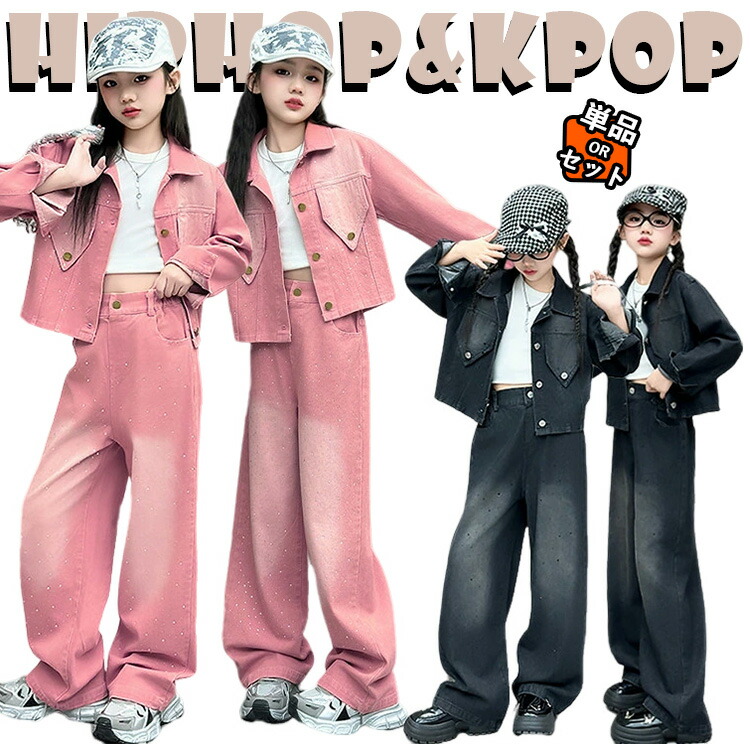 キラキラ 女の子 セットアップ ピンク ブラック デニムパンツ デニムジャケット カジュアル ヒップホップ 韓国 - ジャズ ダンス 春秋 ゆったり キッズ ダンス衣装 上下セッ
