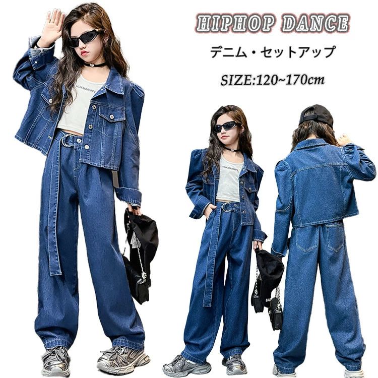 セットアップ デニムセット ブルー カジュアル 女の子 青 デニムパンツ デニムジャケット ゆったり ヒップホップ 韓国 k-pop jazz ジャズ ダンス 春秋 キッズ ダンス衣装 上下セット