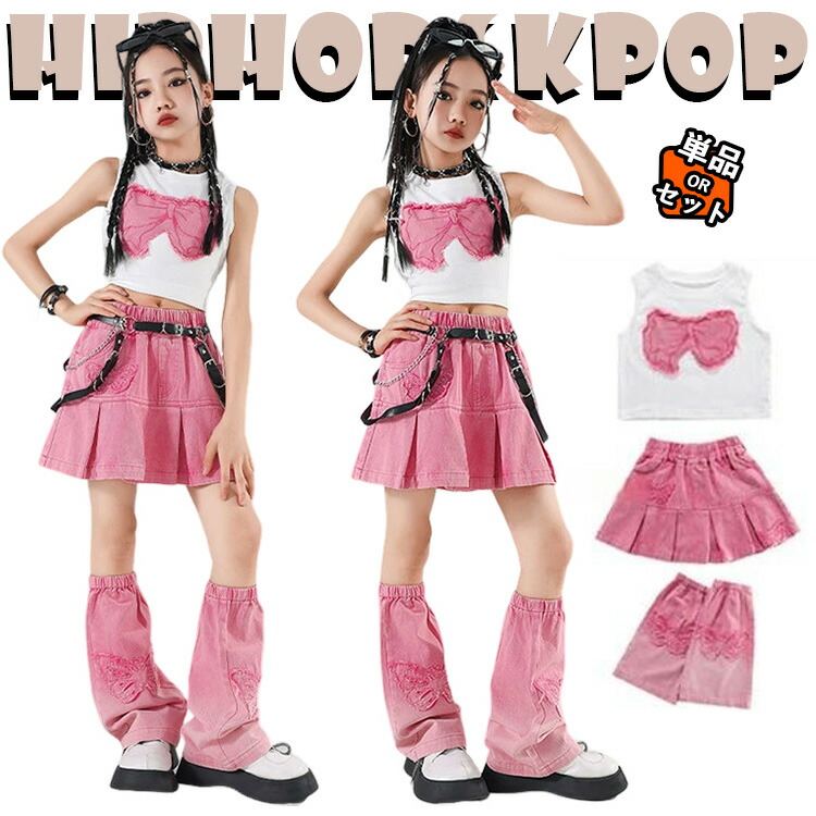 デニムスカート ピンク 白 ショートトップ 蝶結び 女の子 jazz チア チアガール チアリーダー 可愛い かっこいい ジーンズダンス 韓国 K-POP キッズ ダンス衣装 おしゃれ へそ出し プ