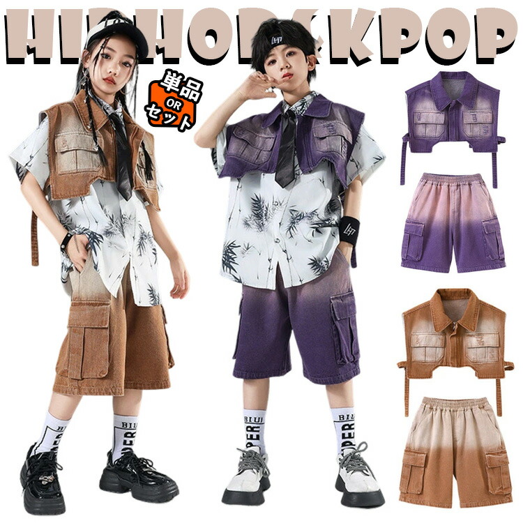 デニム短パン デニムベスト 柄シャツ デニムセット セットアップ 女の子 男の子 キッズ ダンス衣装 カーゴパンツ パープル ブラウン 半袖シャツ ベスト 半ズボン かっこいい ヒップホ