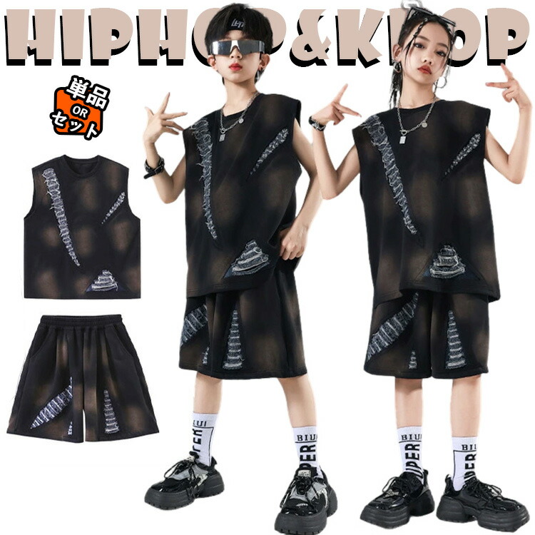 トップス 短パン 袖無し ダメージ加工 ゆったり カジュアル セットアップ 女の子 男の子 キッズ ダンス衣装 半ズボン ブラック かっこいい ヒップホップ 韓国 k-pop jazz HIP-HOP