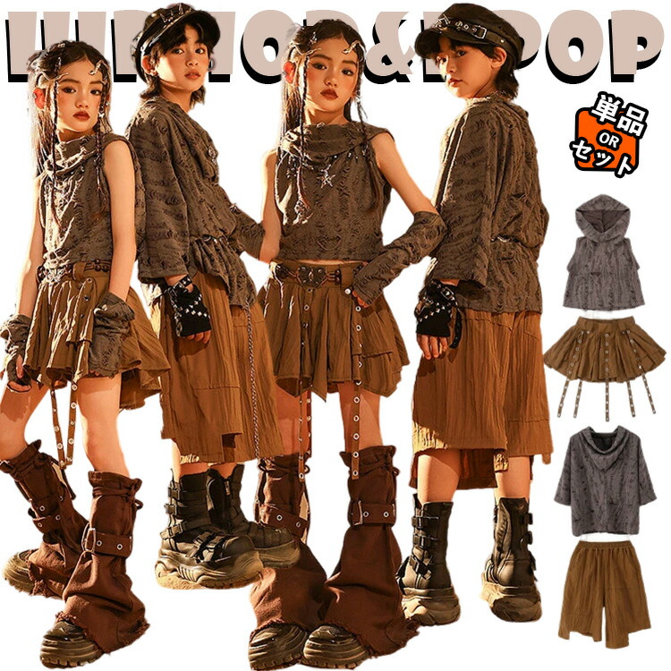 グレー パンク風 ダメージ加工 カバーアップ キッズ ダンス衣装 セットアップ おしゃれ ファッション 肩だし 女の子 男の子 半袖 トップス ギャル系 ジャズダンス ヒップホップ 発表