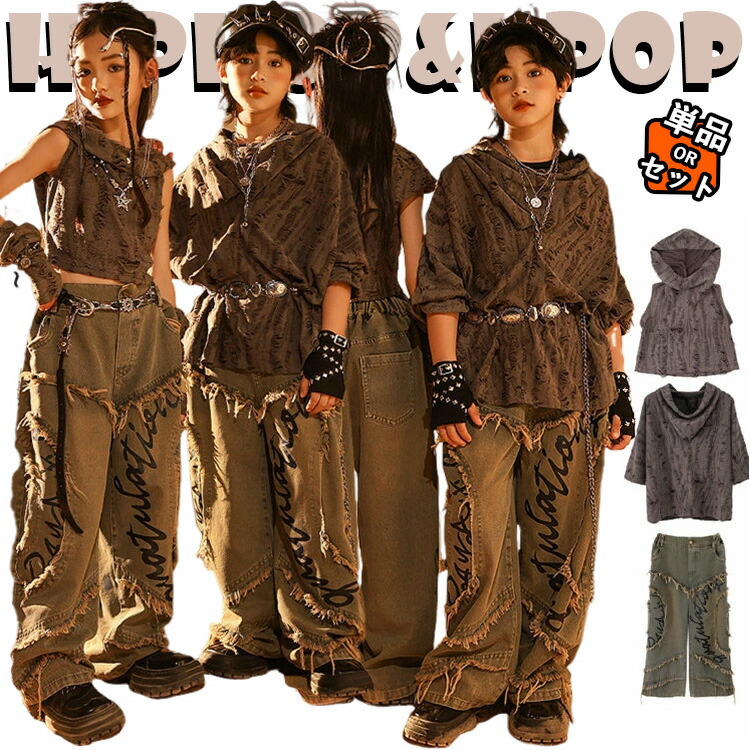ダメージ加工 シリーズ グレー パンク風 デニムパンツ キッズ ダンス衣装 セットアップ カバーアップ ショート丈 おしゃれ ファッション 肩だし 女の子 男の子 トップス 韓国 -