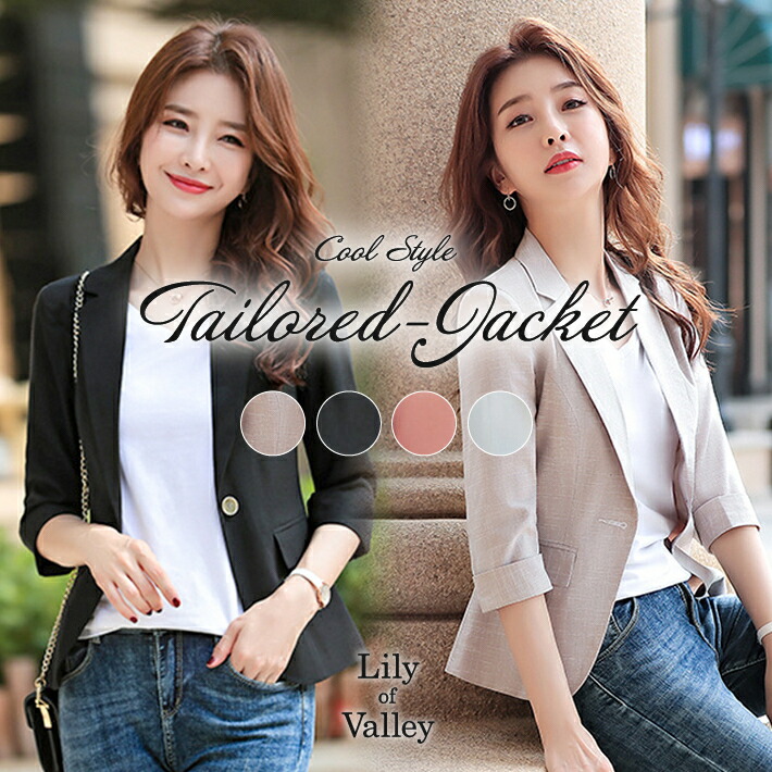 サラッと着れてクールに決まる♪オフィスカジュアル 七分袖 ショート テーラード ジャケット 襟付き 無地 タイト 薄手 フォーマル 事務服 ベージュ ピンク 黒 白 通勤 きれいめ 清楚