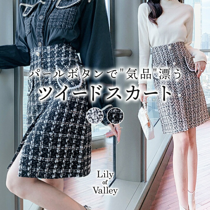 気品漂う華やかな フロント パールボタン ツイード ミニ スカート レディース ボトムス ショート丈 スリット 結婚式 二次会 パーティー 膝上 台形 お呼ばれ チェック 柄 韓国