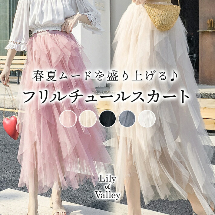 春夏ムードを盛り上げてくれる フリル チュール ロングスカート レディース ボトムス Aライン 無地 ドレス シフォン ティアード ミモレ丈 膝下 韓国 ハイウエスト ふんわり