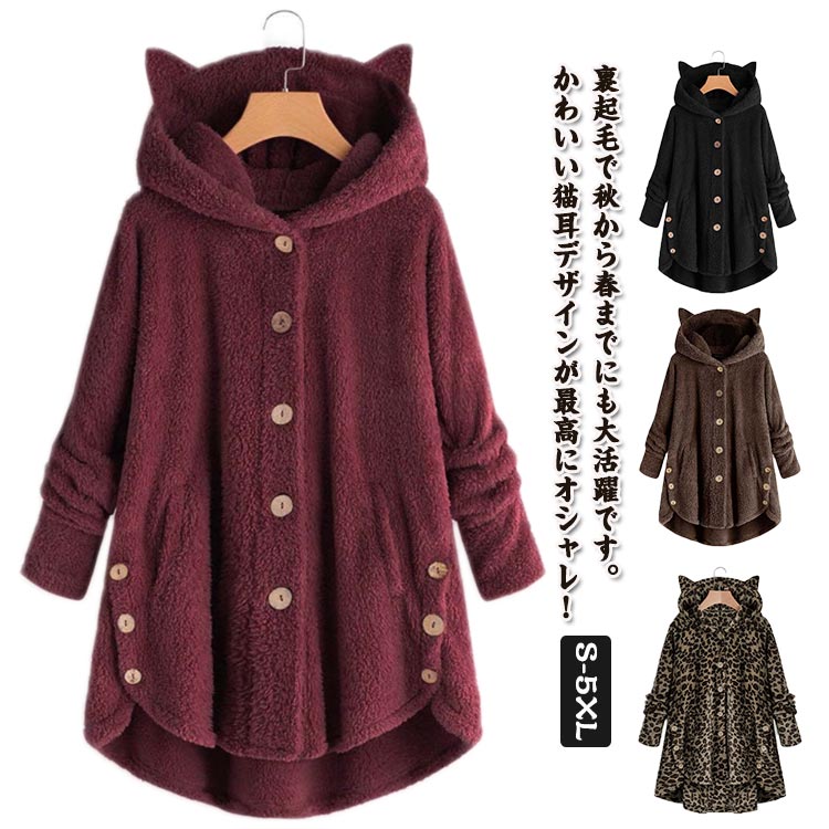 猫耳 パーカー オーバーサイズ ボタン ロング フード付 裏起毛で秋から春までにも大活躍 猫耳フード付き パーカー レディース ロング ジャケット ボアコート