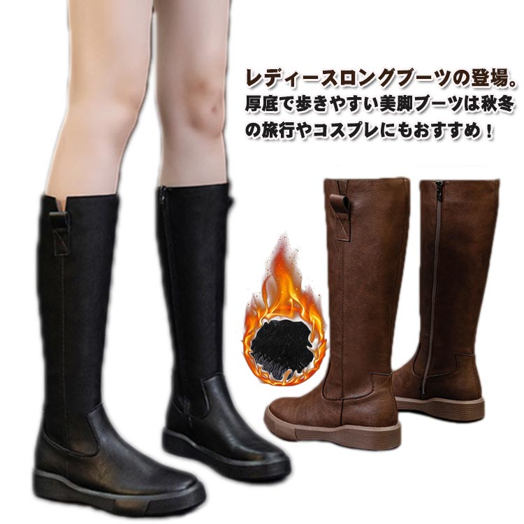 ロングブーツ ジョッキーブーツ レディース 厚底 疲れない ゆったり 筒周り ローヒール 美脚 黒 茶色 ロング丈 ブーツ シンプル ジッパー 秋 春 冬 お出かけ デート