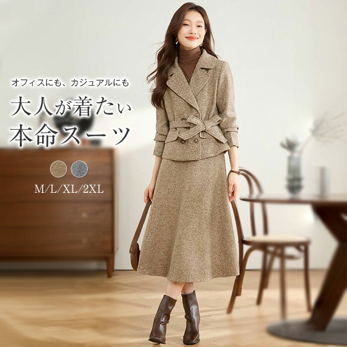 スカートスーツ 2点セット セットアップ レディース スカート ライン テーラードジャケット ツイード調 ロングスカート 長袖 春 秋 レディース ジャケット 着痩せ 女性らしい きれいめ