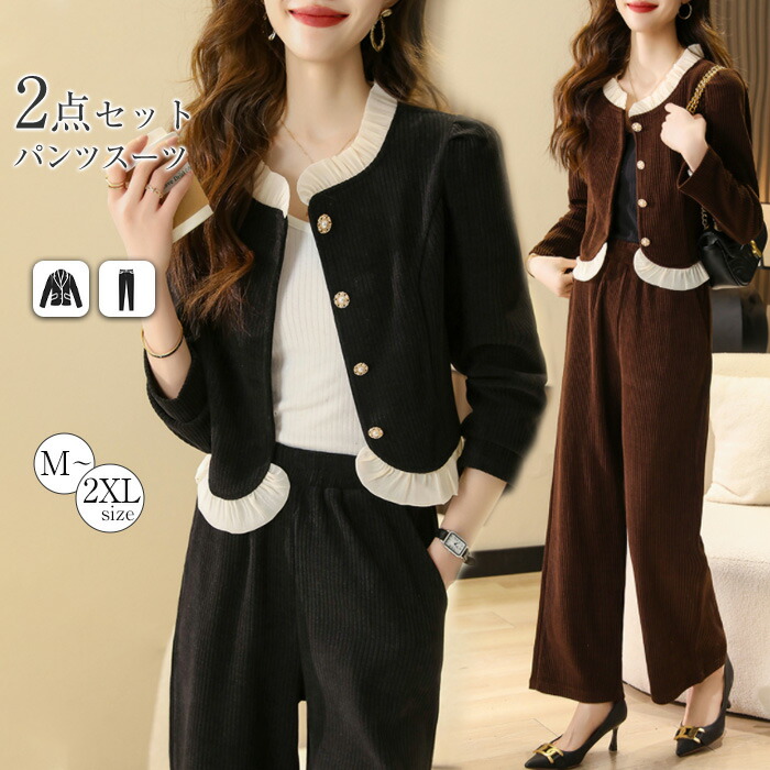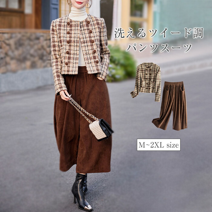 パンツスーツ セットアップ レディース チェック柄 ジャケット 2点セット スーツ ジャケット ノーカラー ワイドパンツ コーデュロイ 秋 ビジネススーツ ノーカラージャケット 着痩せ