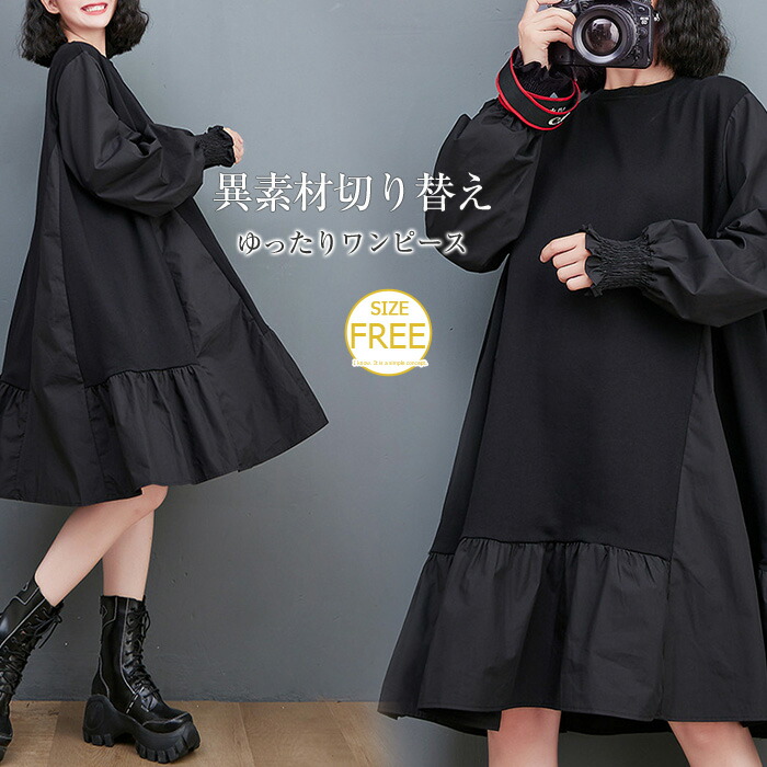 ワンピース 長袖 レディース 春 秋 切り替え Aライン ロング丈ワンピース 大きいサイズ ビッグシルエット ゆったり 体型カバー 着痩せ シンプル カジュアル 大人可愛い ママワンピース