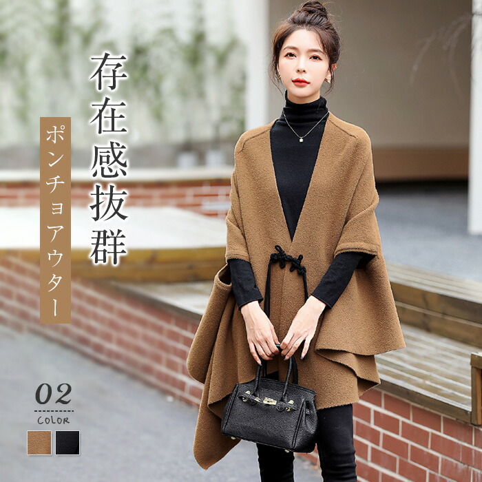 ポンチョ コート ウール混 ストール風 カーディガン ケープ マント ショール レディース アウター メルトン ジャケット 長袖 暖かい 防寒 ブラック 黒 春 秋 オフィス フォーマル