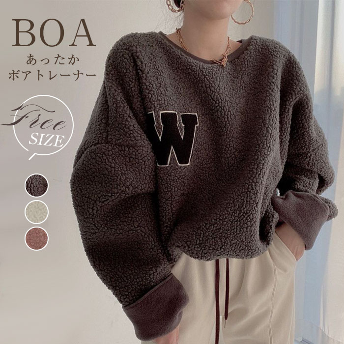 トレーナー レディース ボア 秋 春 冬 長袖 カレッジ ロゴ カットソー 大きめ ゆったり トップス 重ね着 トレーナー レイヤード もこもこ 厚手 あったか 体型カバー シンプル カジュアル