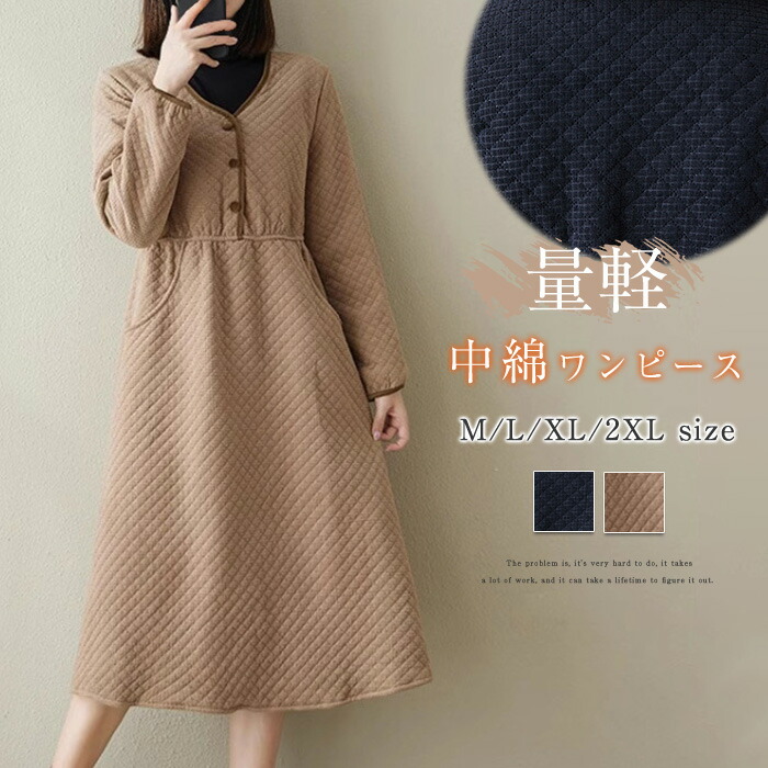 ワンピース ロング丈 レディース 春 秋 冬 中綿 ワンピース ロング ライン ゆったり 体型カバー カジュアル ロング丈ワンピ 厚手 ワンピース 大人 ゆるっと 着痩せ ママコーデ
