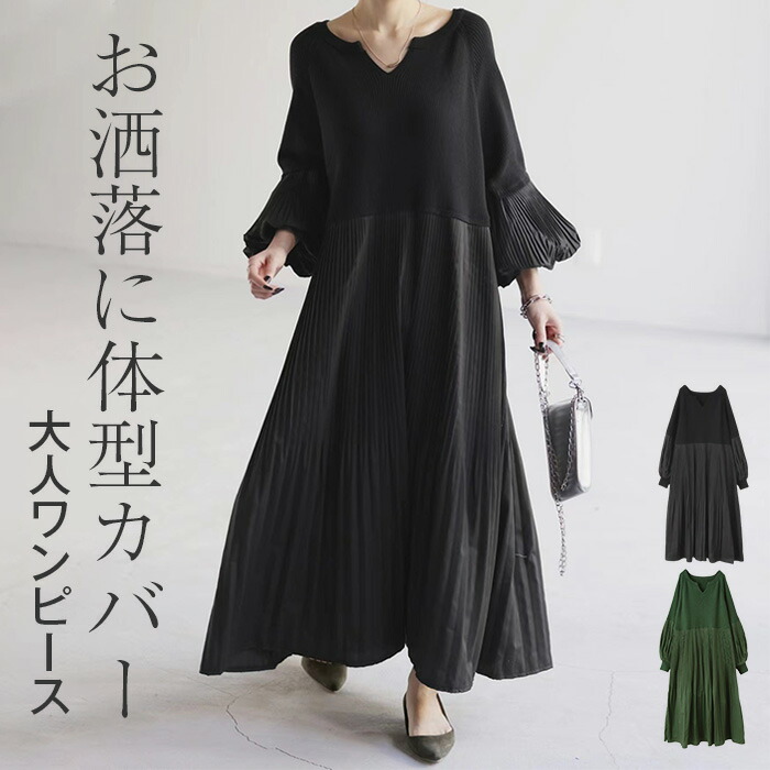 ワンピース レディース 春 秋 冬 ワンピース ロング丈 ニット 異素材 切り替え 長袖 プリーツ ワンピース キーネック 体型カバー おしゃれ ニット ワンピース ロング丈 ニット 切り替え