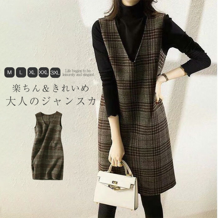 ワンピース 春 秋 レディース チェック ツイード調 ジャンパースカート ジャンスカ ウール混 オールインワン ワンピ ノースリーブ タンクワンピース 重ね着 大人 かわいい きれいめ
