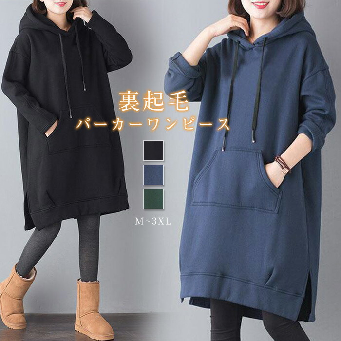パーカー ワンピース レディース 春 秋 チュニック ワンピース 微起毛 長袖 パーカー ロング丈 フード付き ワンピース チュニック丈 大きいサイズ ゆったり 体型カバー 暖か オシャレ