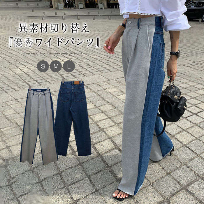 ワイドパンツ レディース 春 秋 異素材切り替え ロング丈 デニム スウェット バイカラー 華奢見え 体型カバー おしゃれ ゆったり カジュアル ナチュラルカジュアル 着痩せ ボトムス